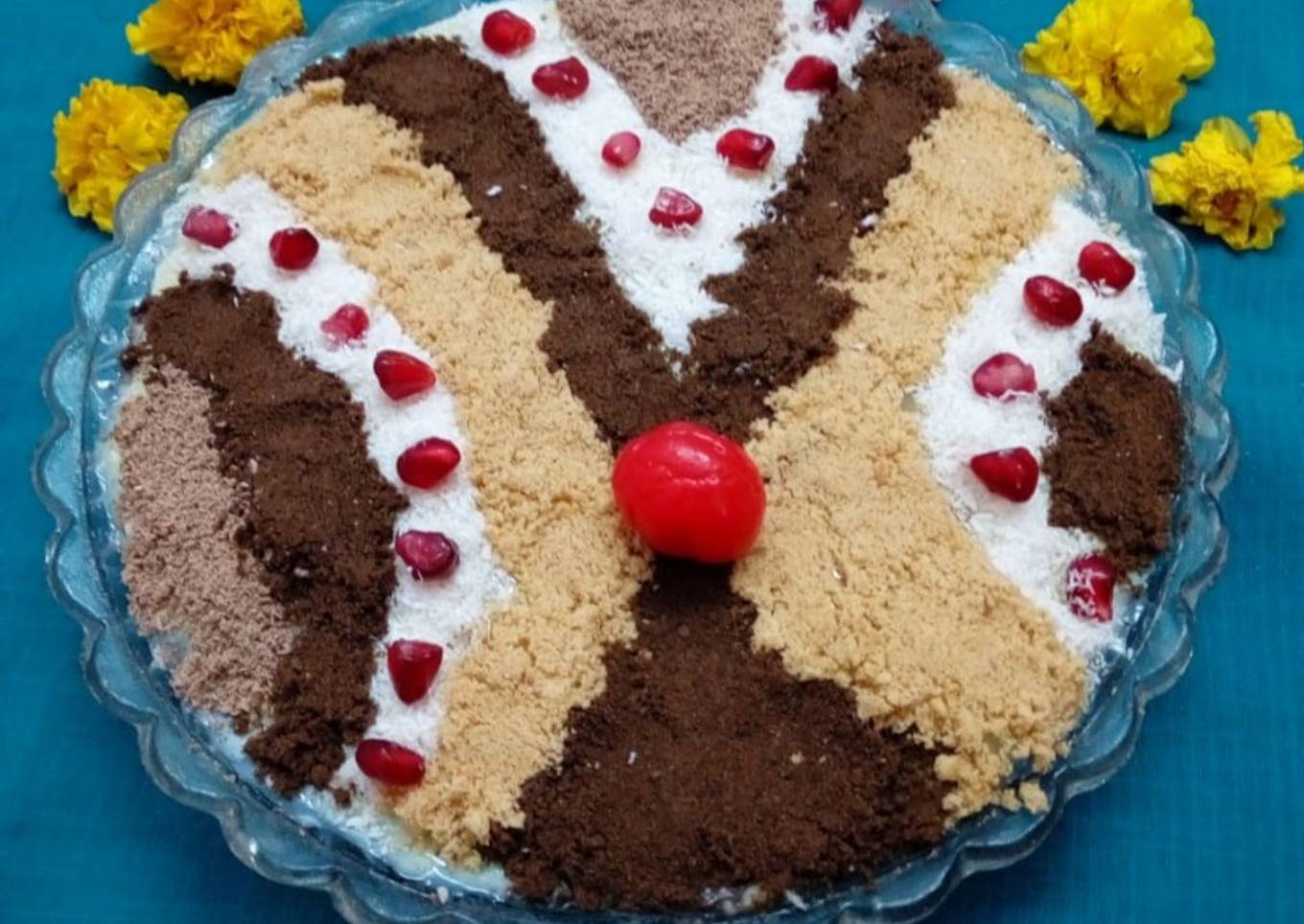 - After 1 hour remove it from the fridge and make design with grinded biscuits, desiccated coconut and grated chocolate bar.you make design as your choice of carpet. Garnish with pomegranate seeds and cherry. Again keep it in the fridge for 1 hour to set the carpet design custard. Serve chilled.
