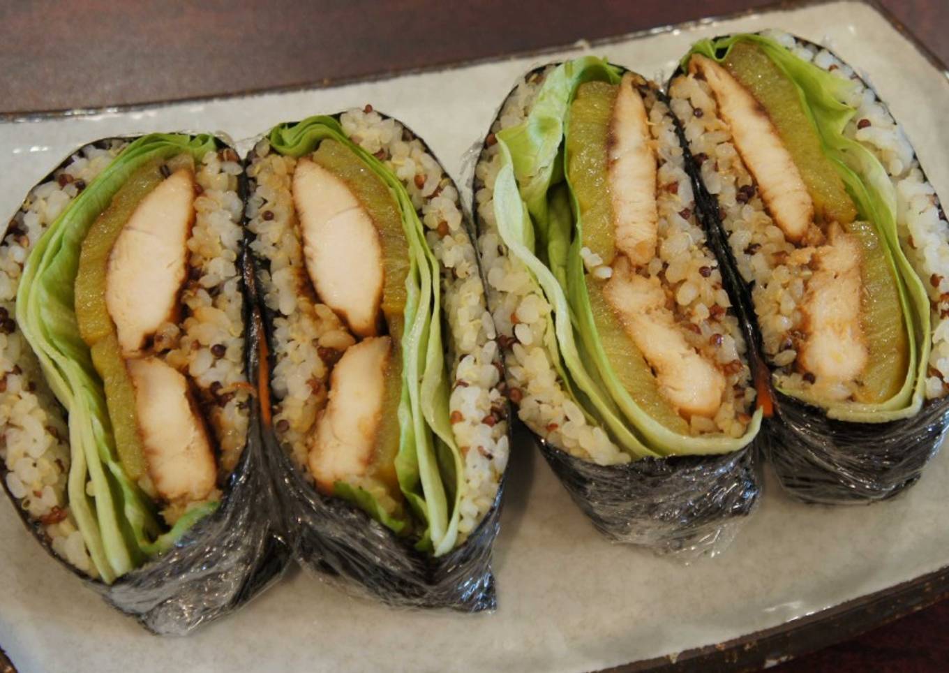 - Let both the chicken and pineapple cool off so you can easily wrap the onigirazu