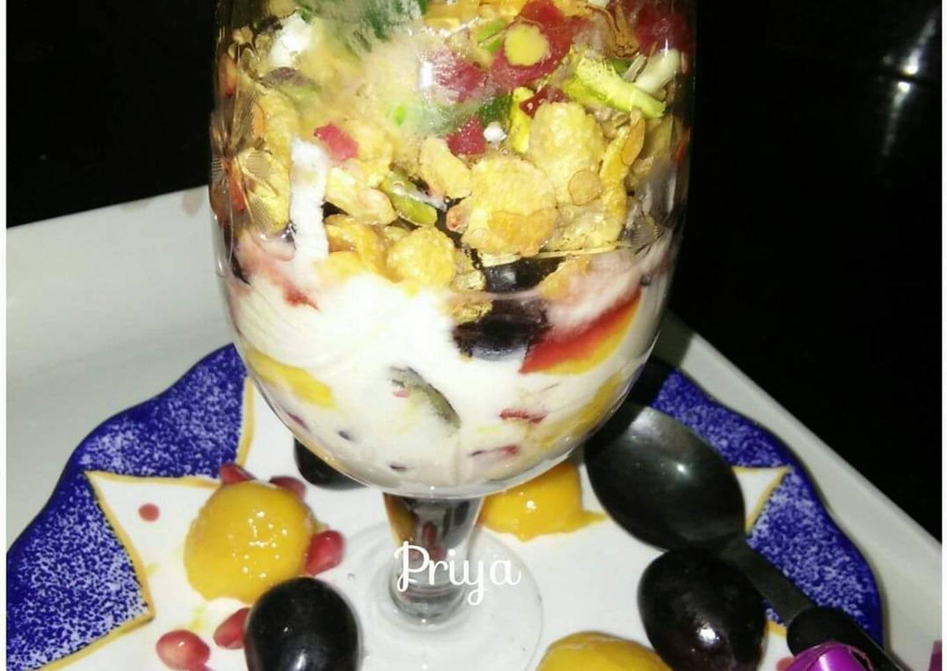 - Take a big glass and add 2 tbsp sweet yogurt paste and then add chopped fruits, some cherry.