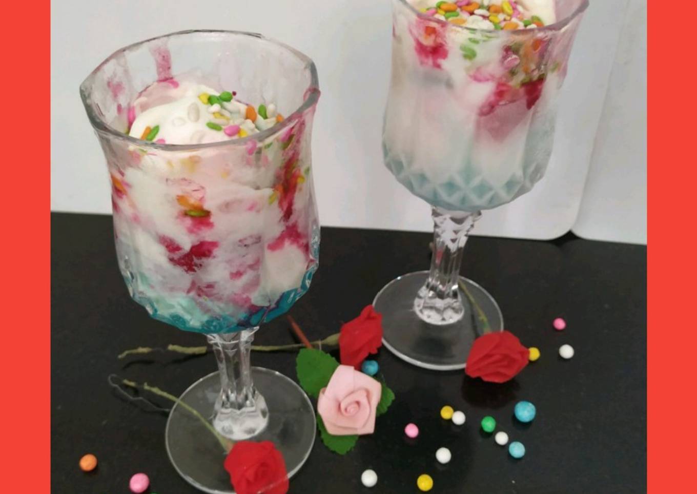 - In glass spread rose syrup, blue lagoon, and strawberry crush.